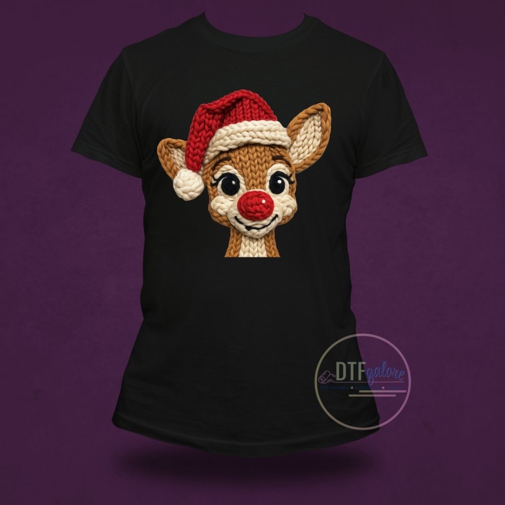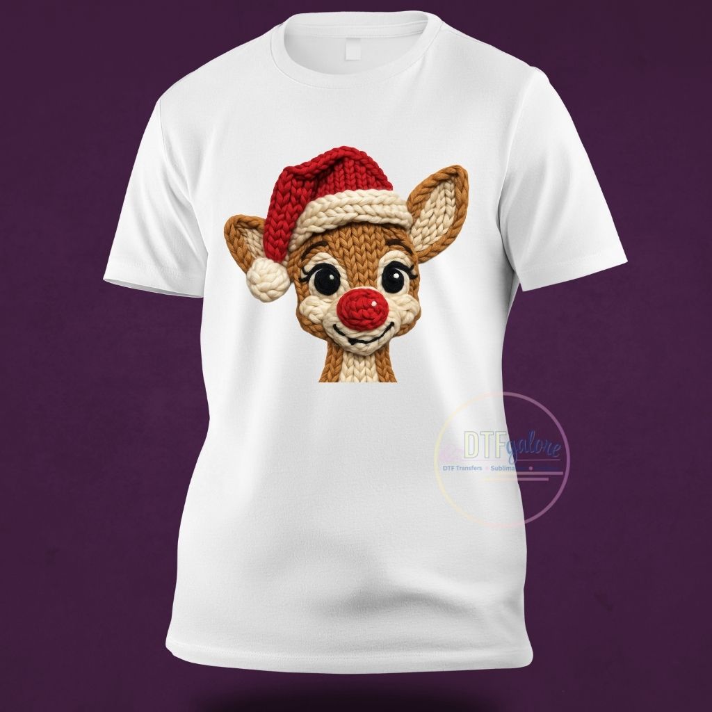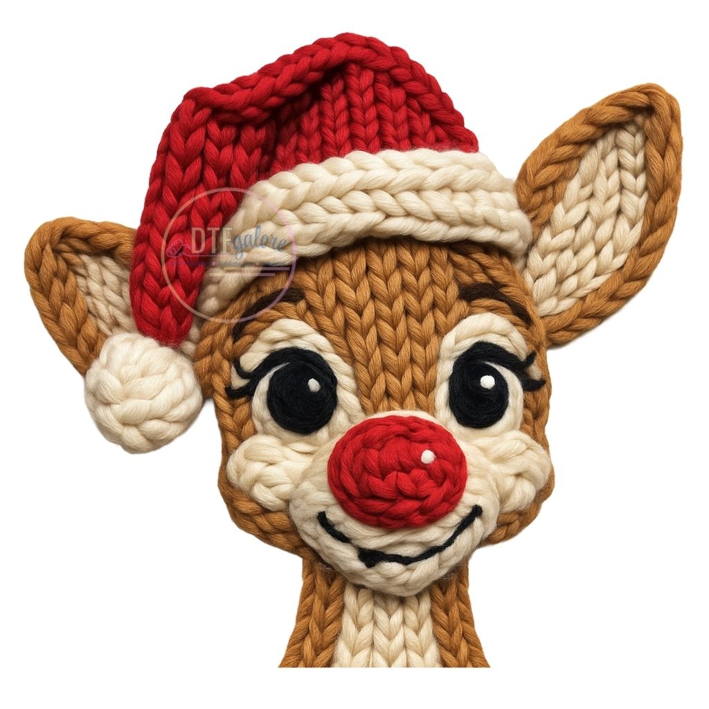 Introducing our high-quality Christmas DTF Transfer, featuring a uniquely crafted red nose reindeer design that resembles a cozy yarn creation. Perfect for adding a festive and warm touch to your holiday projects!